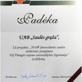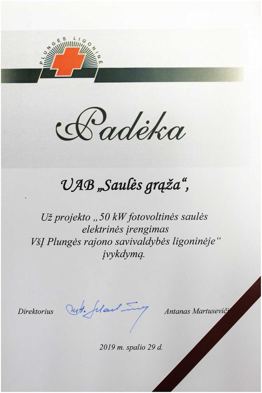 Saulės energijos panaudojimo galimybės yra plačios: pastatų šildymas bei apšvietimas, elektros energijos gaminimas, vandens šildymas, elektromobilių įkrovimas ir kitų veiklų tenkinimas. Saulės energijos teikiamais privalumais pasinaudojo ir Plungės r. savivaldybės ligoninė. Siekiant efektyvaus gamtos išteklių naudojimo bei elektros suvartojimo išlaidų mažinimo, 2019 m. „Saulės grąža” įrengė 50 kW fotovoltinę saulės elektrinę, sumontavo du 33 kW galios Huawei inverterius bei 131 vnt. Soluxtec 310W galios modulius.